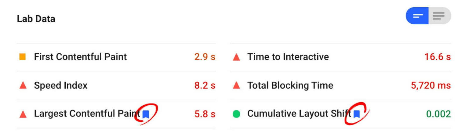 There are a few ways to determine whether your website passes or fails Core Web Vitals. While an SEO support platform called Google Search Console offers all kinds of helpful data, one of the easiest ways involves dropping your website into Google’s PageSpeed Insights tool. Do you see any metric with a blue ribbon attached? Those are Core Web Vitals.