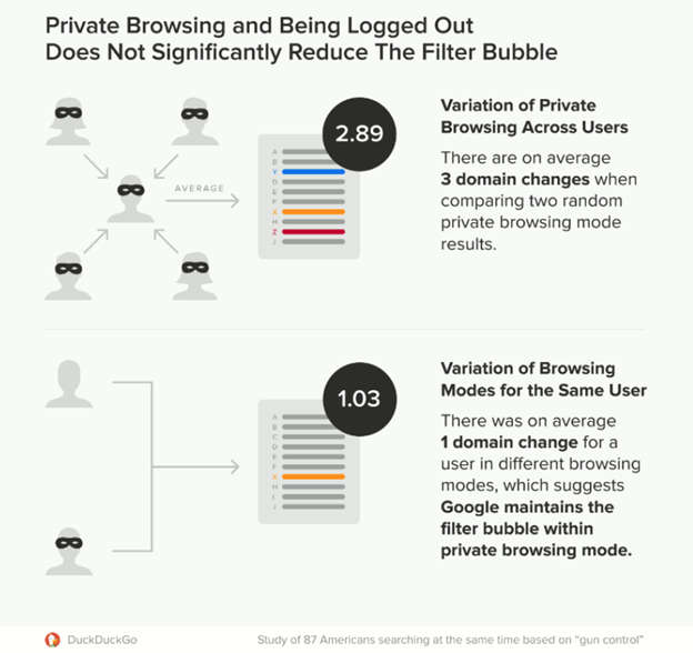 Suppose Google truly stands by its statement that it will show different results to people in incognito based on their device, IP/physical location. Why were there not far more unique results for people around the country? Is this because Google uses a filter bubble, as DuckDuckGo believes?