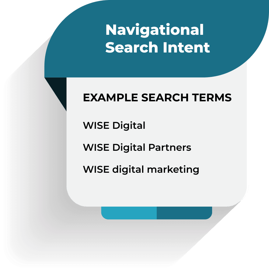 When someone is trying to find something very specific and already knows what they’re looking for, it’s called navigational search intent. For instance, perhaps they already know the brand they’re looking for and just need to find the website. An example would be if someone has heard of WISE Digital Partners and they go to Google to find out more information.