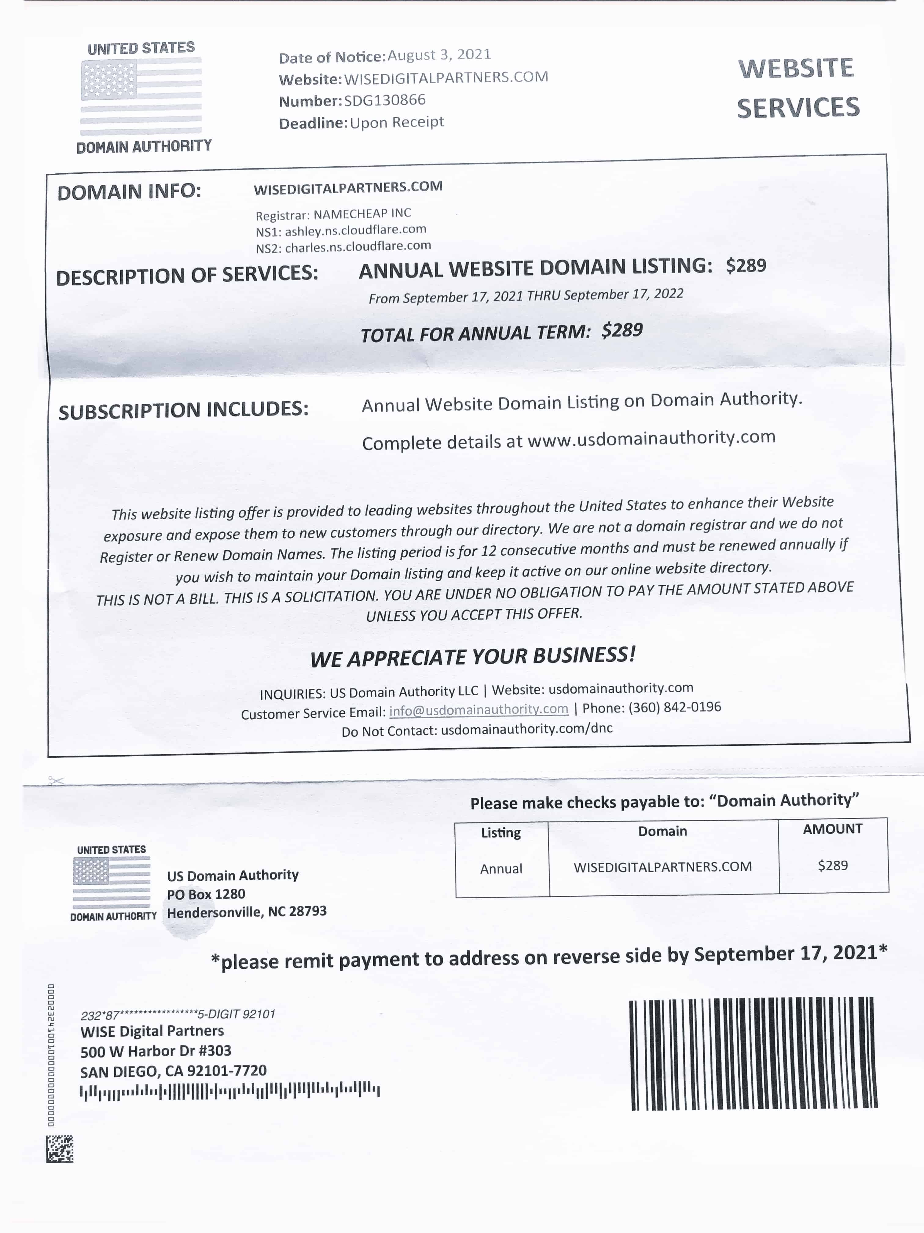 Generally, these letters also have very clear language that people often skim past, noting that it’s NOT a bill but a solicitation of services. Here’s an example from one scam company, DOMAIN LISTINGS, based in Las Vegas, Nevada: