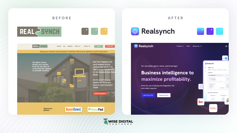 As a software-as-a-service business serving real estate professionals, Real Synch needed a more polished, compelling brand identity to match the sophistication of its product. While their name remained the same, WISE reimagined how the brand showed up, starting with a modern logo, streamlined color palette, and messaging that resonates with their digital-first audience. The result? A cohesive brand experience that builds trust and drives conversions.