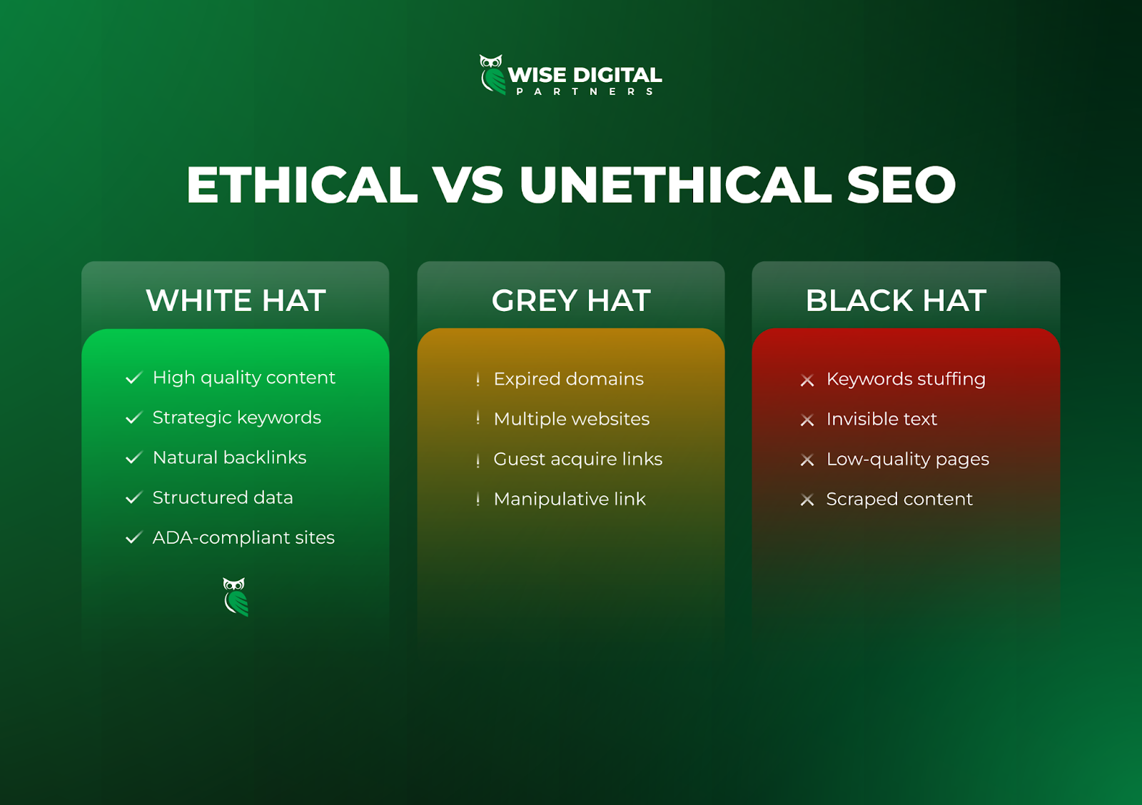 WISE takes a strictly white hat approach to SEO, meaning our focus is on: