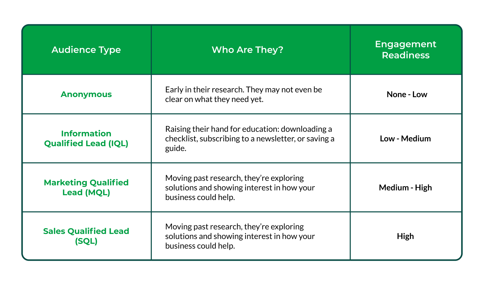 The simplest way to think about lead quality is to map leads by where they are in the customer journey and understand what that means for their readiness to engage.