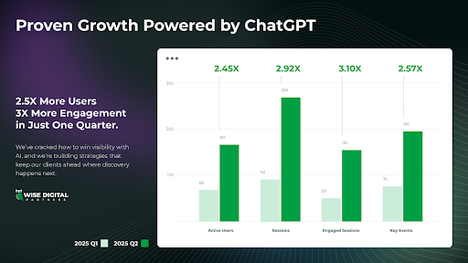Last year alone, WISE Digital secured over half a million dollars in new business from AI-generated leads. And today? We meet with an average of three to five new clients a week who have found us through platforms like ChatGPT. This year, we’re already on track to sign more than $1 million in new business from prospective clients who found us through an AI search for a new digital marketing partner. Our largest new client contract to date was the direct result of the owner discovering us on ChatGPT. We know exactly what they used as their prompt, and we understand how we appeared as the first result. That's not luck—it's strategy.