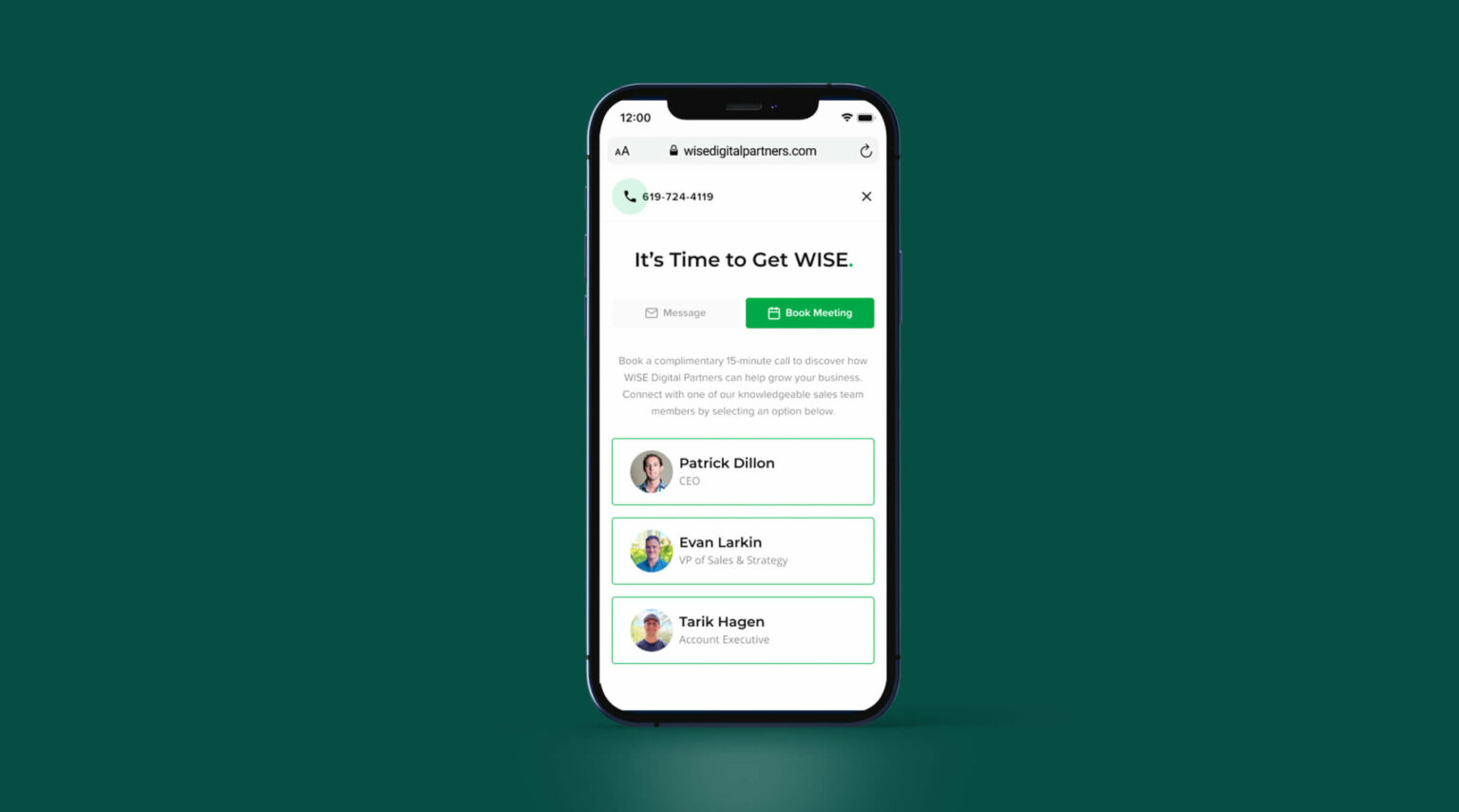 For example, here at WISE Digital, we offer website visitors an option to book a 15-minute call with someone on our sales team, including our CEO. It’s worked well for us and is a great way to connect with potential clients personally.
