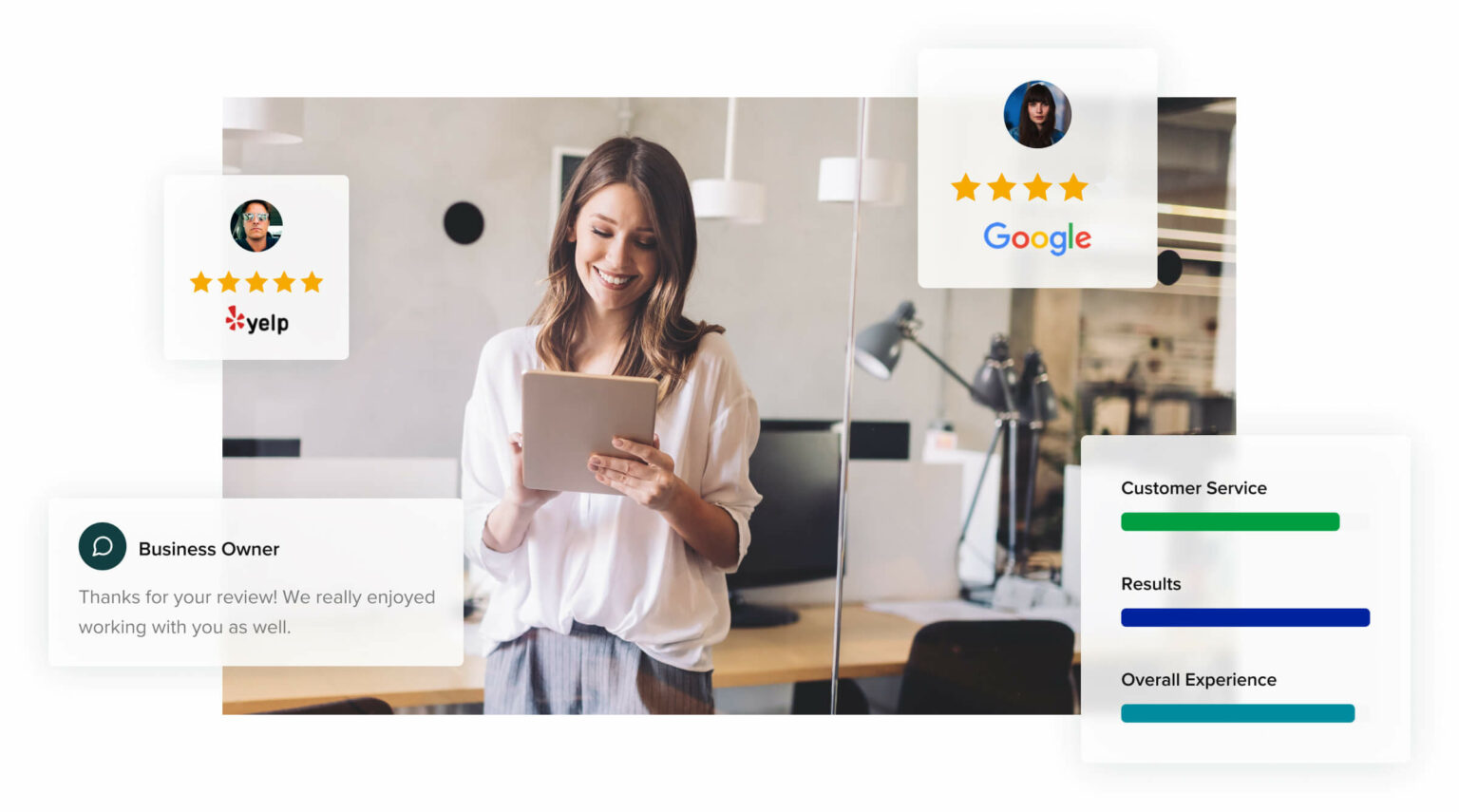 That’s why we built a reputation management platform that aggregates reviews from multiple sources (i.e., Yelp, Google, Facebook) and seamlessly integrates them with your website.