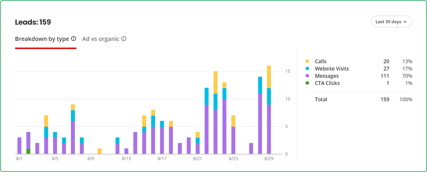 The snapshot below shows how many leads came in from Yelp ads for one of our roofing clients in just 30 days. The budget for the month was $2,500, meaning the average cost per lead was just $15.72.