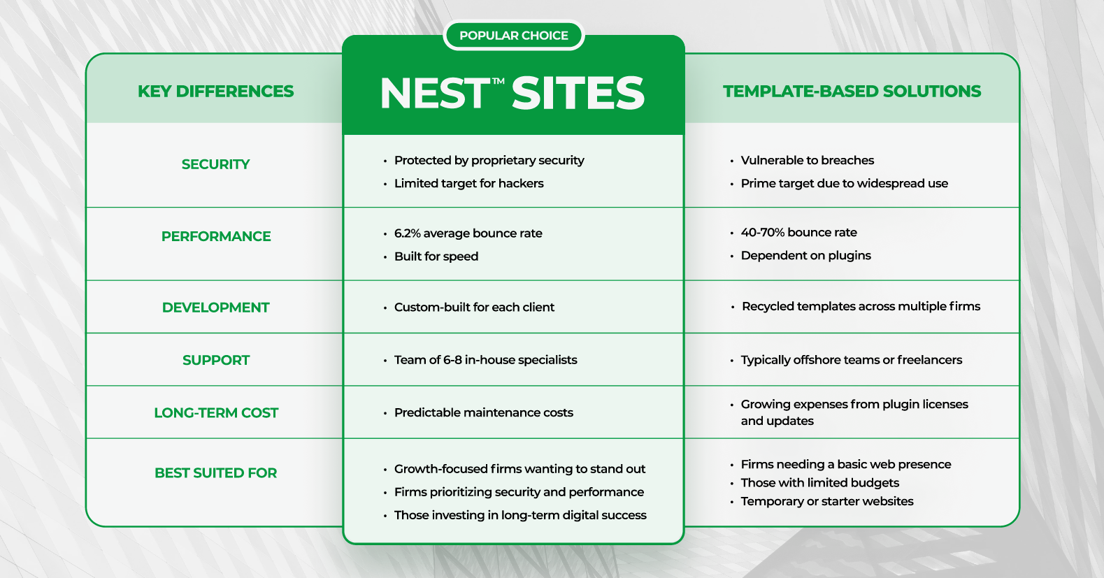 While NEST’s technical advantages are clear, we can’t really talk about the platform without mentioning the people behind it and how they approach your firm’s digital presence. Here’s what sets us apart.