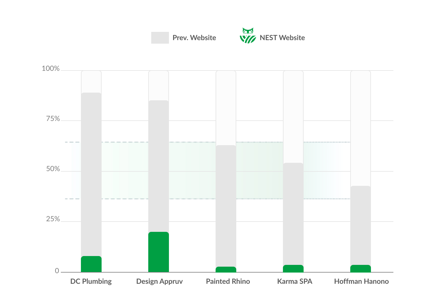 Let’s take a look at how our client websites were performing with their average bounce rate percentages before and after they switched to our NEST platform. Keep in mind, the average bounce rate across all industries is 40%-60%.